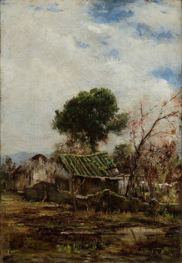 Eugenio Guzmán realizó sus paisajes a la acuarela, dibujos a lápiz o con pintura al óleo, como es el caso para estas dos telas realizadas durante una primavera. Esa estación del año es más evidente en Primavera, en tanto un solitario árbol florido destaca en Paisaje caserío. Además de la pequeña casa en esta última escena, la presencia de estas arboledas denota presencia humana, considerando que las especies nativas de la zona central de Chile no presentan un florecimiento que destaque en cuanto a flores y colorido, de modo que se trataría de almendros u otros cultivados para la producción de fruta.